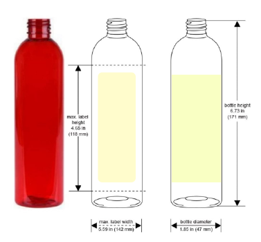 For example, an 8 oz cosmo bottle is about 6″ around and the height of the label-able area is about 4.5 inches. Therefore you could use a 6″ x 4″ label OR you could use two labels (front and back) that are 2″ x 4″.